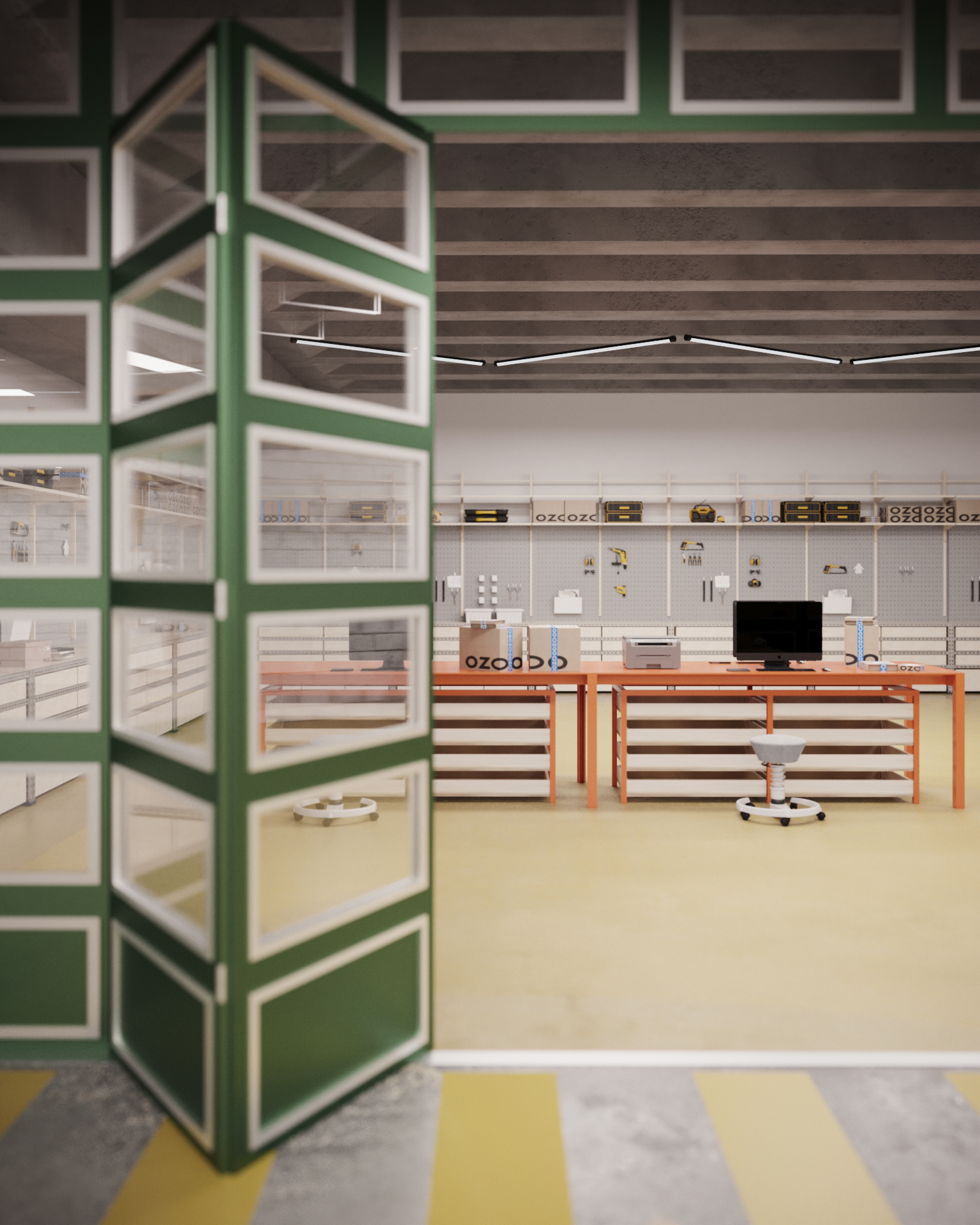 We actually wrote a whole book together with one of the original architects, historians, people working here in the 80s and many more, to honor the legacy of the building. Apart from the structure itself, a custom color palette with a signature orange-yellow, a green, and two blues was developed for Tomteboda. As you can see, the original color scheme is still here, and it was a vital part of the interior design and the visualizations. We also focused on highlighting the industrial elements of the building, concrete can be really beautiful when treated properly.